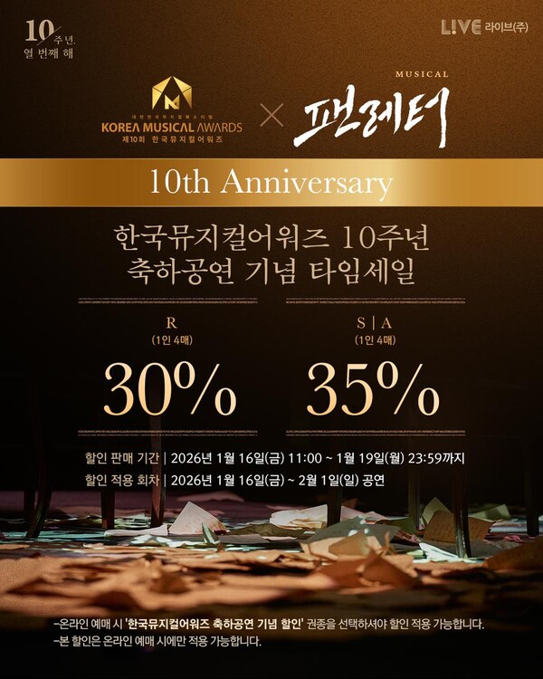 (더쎈뉴스 / The CEN News 주민혜 기자) 10주년을 맞은 창작 뮤지컬 '팬레터'가 '제10회 한국뮤지컬어워즈'의 축제 무대를 열며, 관객들을 위한 특별 할인 이벤트를 선보인다.