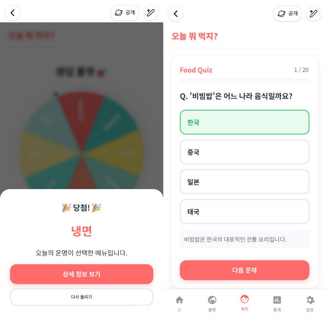새로 생성된 앱은 △홈 △룰렛 △퀴즈 △통계 △설정 등 총 5개의 탭으로 구성돼 한층 번듯한 모양새를 갖췄다. ‘오늘 뭐 먹지?’ 버튼을 누르면 단순히 메뉴 이름만 띄우는 것을 넘어 주재료와 가격, ‘상큼’·‘따뜻’·‘신선’과 같은 키워드까지 함께 제공했다. 예산 관리를 위한 통계 화면과 음식 관련 퀴즈 기능까지 탑재됐다.