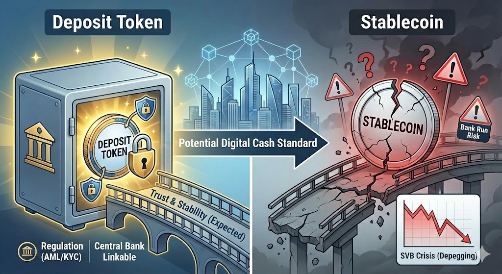 스테이블코인이 결제·정산 인프라 논의의 중심으로 떠올랐지만, 발행사 신뢰가 흔들리면 1대1 가치연동(페깅) 자체가 깨질 수 있다는 우려도 함께 커지고 있다. 이와 함께 일각에서는 예금토큰(Deposit Token)이 '규제 안에서 작동하는 디지털 현금' 대안으로 조명받는 모습이다.