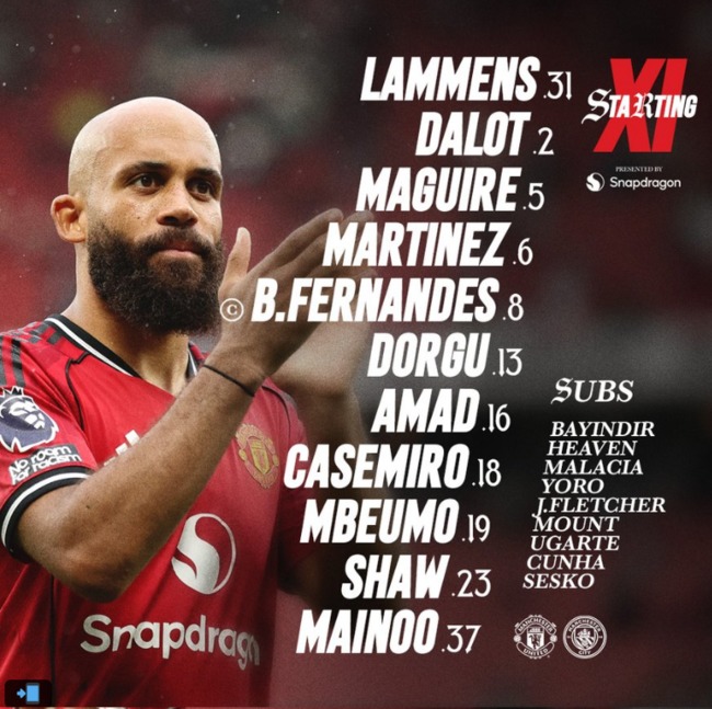 맨유는 4-2-3-1 포메이션을 꺼냈다. 최전방 음뵈모, 2선 도르구, 페르난데스, 아마드다. 허리는 마이누, 카세미루이며 포백은 쇼, 마르티네스, 매과이어, 달롯이다. 골문은 라멘스가 지킨다.