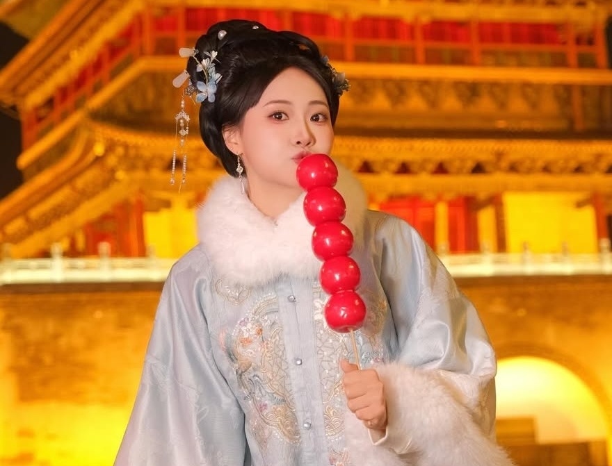 채유정은 중국 전통 의상을 입고 성 앞에서 여러 자세를 취하며 사진을 찍었다. 헤어스타일도 의상에 맞게 바꿨고, 손에 부채나 탕후루를 들어올리는 등 '중국 여성 스타일'의 멋을 한껏 냈다.