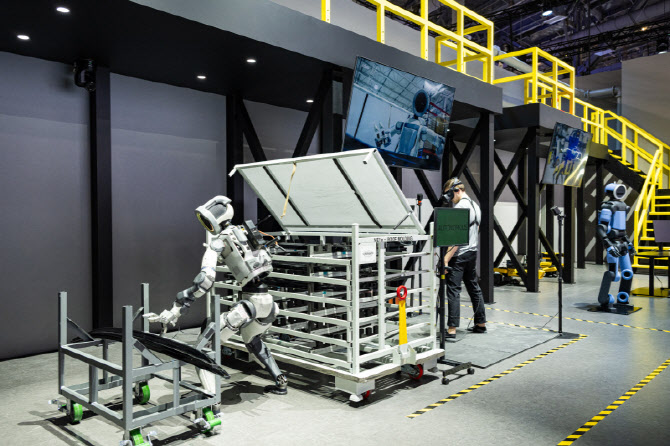 CES 2026 현대차그룹 전시관에서 아틀라스가 자동차 부품을 옮기는 작업을 시연하는 모습 (사진=현대차그룹) |