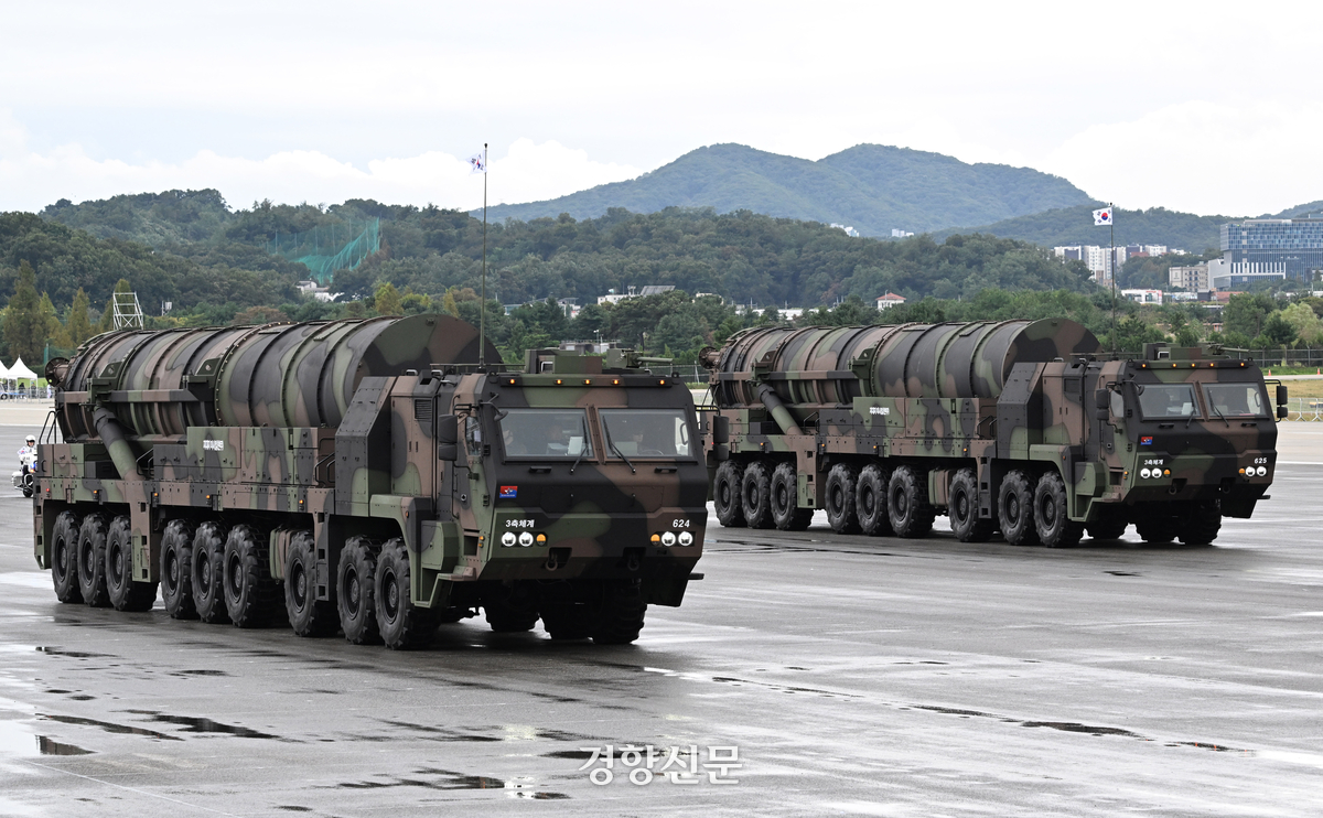 2024년 10월 1일 경기 성남 서울공항에서 열린 제76주년 국군의날 기념식에서 지대지 미사일 현무-5가 이동하고 있다. 대통령실사진기자단 |