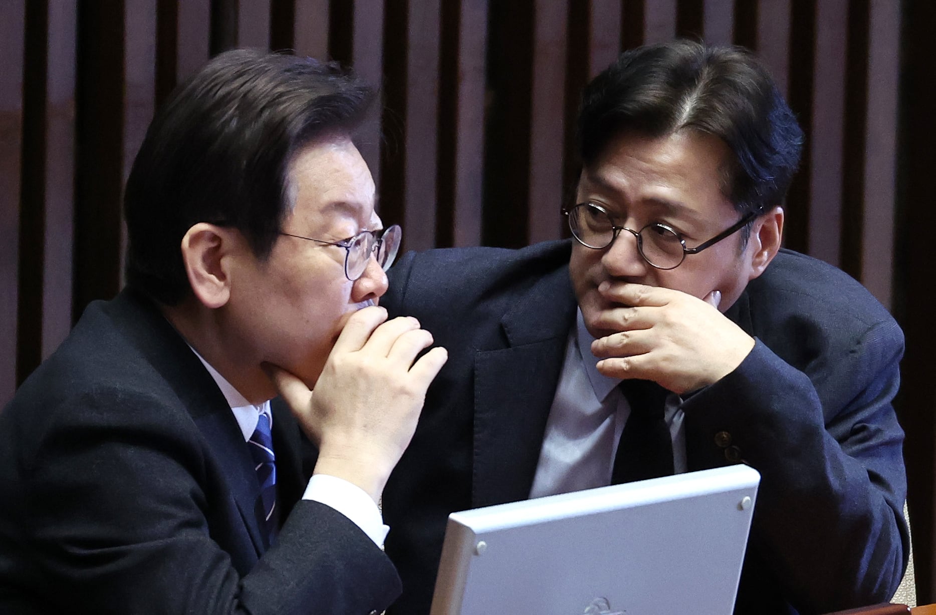 2024년 2월 21일 당시 더불어민주당 이재명 대표와 홍익표 원내대표가 서울 여의도 국회에서 열린 본회의에서 대화하고 있다./뉴스1 |