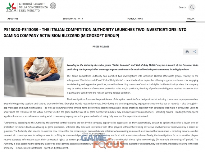 이탈리아 경쟁당국(이하 AGCM)이 현지시간으로 16일, 마이크로소프트의가 소유한 액티비전 블리자드가 서비스하는 ‘디아블로 이모탈’과 ‘콜 오브 듀티 모바일’이 미성년자를 포함한 사용자들이 충분한 인지 없이 게임 내 구매를 유도하는 메시지를 포함하고 있는 것으로 확인, 조사를 시작했다고 밝혔다.