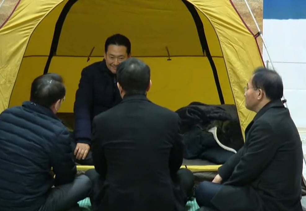 오세훈 서울시장(앞줄 가운데)이 18일 오후 서울 여의도 국회에서 나흘 째 단식을 하고 있는 장동혁 대표를 찾았다. 앞줄 왼쪽부터 유정복 인천시장, 오 시장, 윤재옥 국민의힘 의원. /국민의힘TV 캡처 |