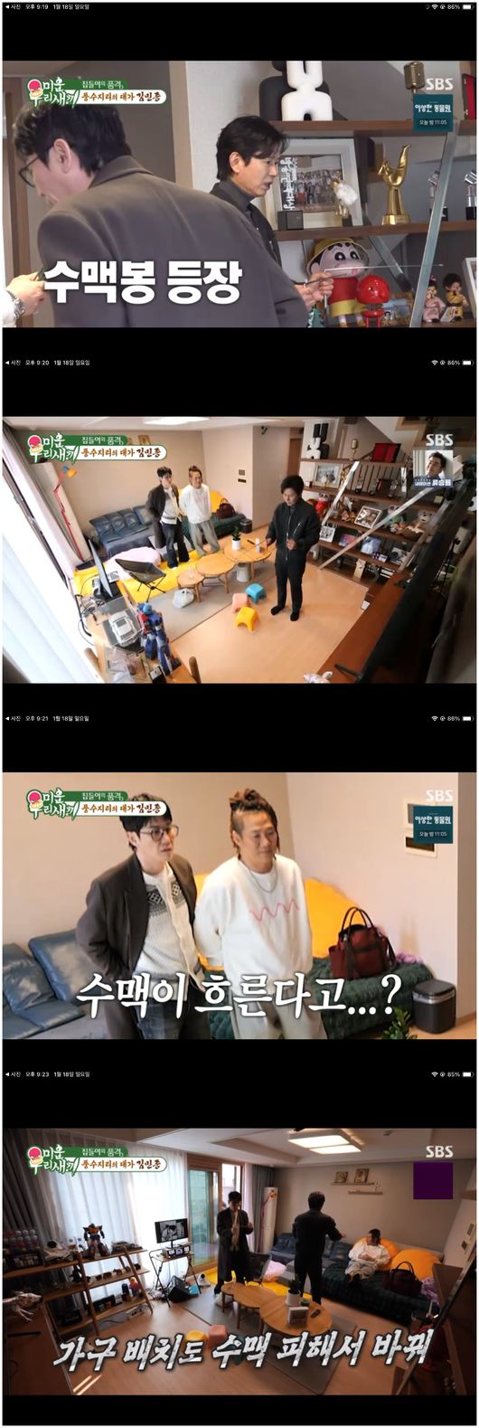 이날 윤민수의 집들이가 시작됐다. 김민종은 이사 선물로 굵은 소금을 담은 소금단지를 꺼냈다. 김민종은 “소금단지를 갖고 왔다. 현관에 둬라. 굵은 소금인데 6개월에 한 번씩 갈아줘라. 받침 안 사왔는데 받침을 해서 둬라”라며 조언했다. 김민종은 현관에 걸린 거울의 방향도 풍수지리에 좋지 않다고 했다.