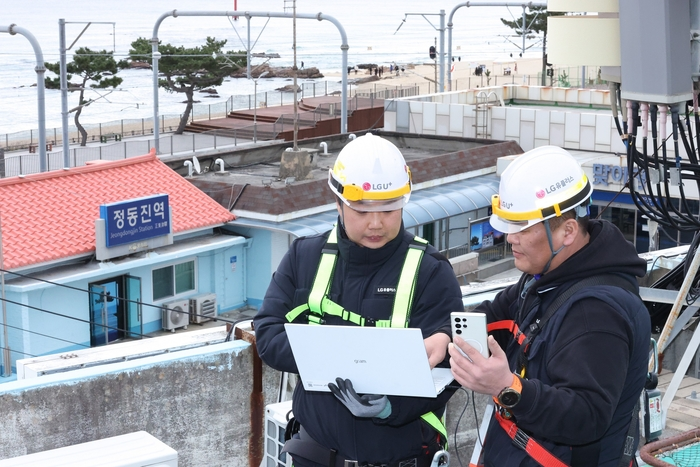 LG유플러스 임직원들이 강원 강릉시 정동진 인근에서 네트워크 장비를 점검하고 있는 모습. |