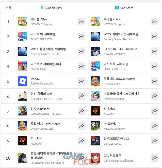 구글 플레이에서는 '메이플 키우기'를 위시로 한 기존 게임들의 순항이 이어지고 있다. TOP 5는 '메이플 키우기', '라스트 워: 서바이벌', '화이트아웃 서바이벌', '라스트 Z: 서바이벌 슈터', '로블록스' 등이 차지하고 있다.