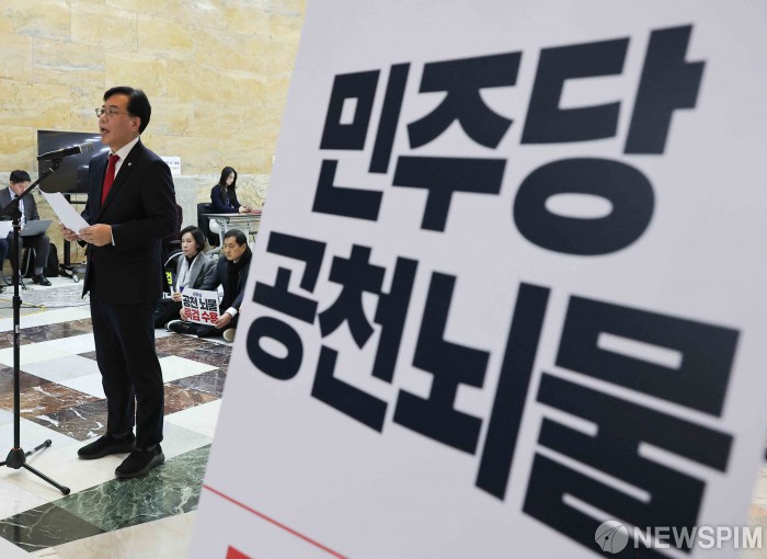 [서울=뉴스핌] 윤창빈 기자 = 송언석 국민의힘 원내대표가 19일 서울 여의도 국회 로텐더홀에서 열린 통일교 게이트·더불어민주당 공천뇌물 특검 촉구 규탄대회에서 규탄사를 하고 있다. 2026.01.19 pangbin@newspim.com
