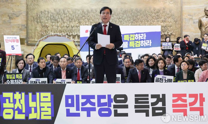 [서울=뉴스핌] 윤창빈 기자 = 송언석 국민의힘 원내대표가 19일 서울 여의도 국회 로텐더홀에서 열린 통일교 게이트·더불어민주당 공천뇌물 특검 촉구 규탄대회에서 규탄사를 하고 있다. 2026.01.19 pangbin@newspim.com