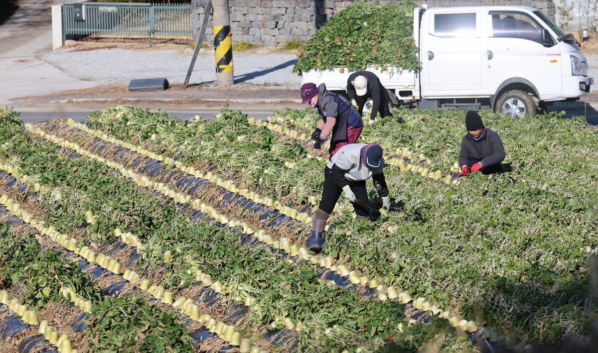지난해 12월 22일 강원 강릉시 경포동 들녘에서 농민과 외국인 노동자들이 막바지 무 수확을 하느라 바쁜 모습이다. 연합뉴스 |