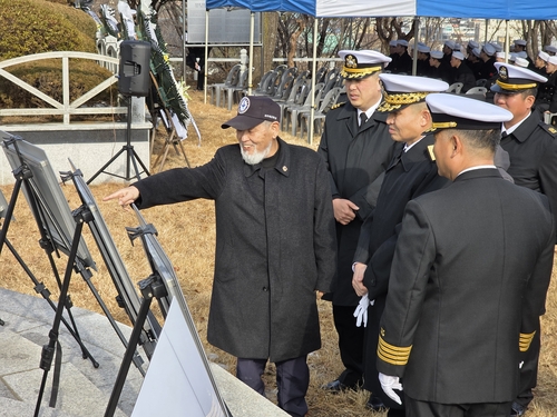 (강원 고성=연합뉴스) 유형재 기자 = 해군 1함대사령부(이하 1함대)는 19일 강원특별자치도 고성군 거진읍에 있는 당포함 전몰장병 충혼탑에서 '제59주기 당포함 전몰장병 추모행사'를 거행했다.
