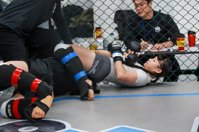 KMMA 여성 플라이급 타이틀전에서 고유나(오른쪽)나 정민지의 팔을 잡고 서부미션 기술을 걸고 있다. 사진=KMMA |