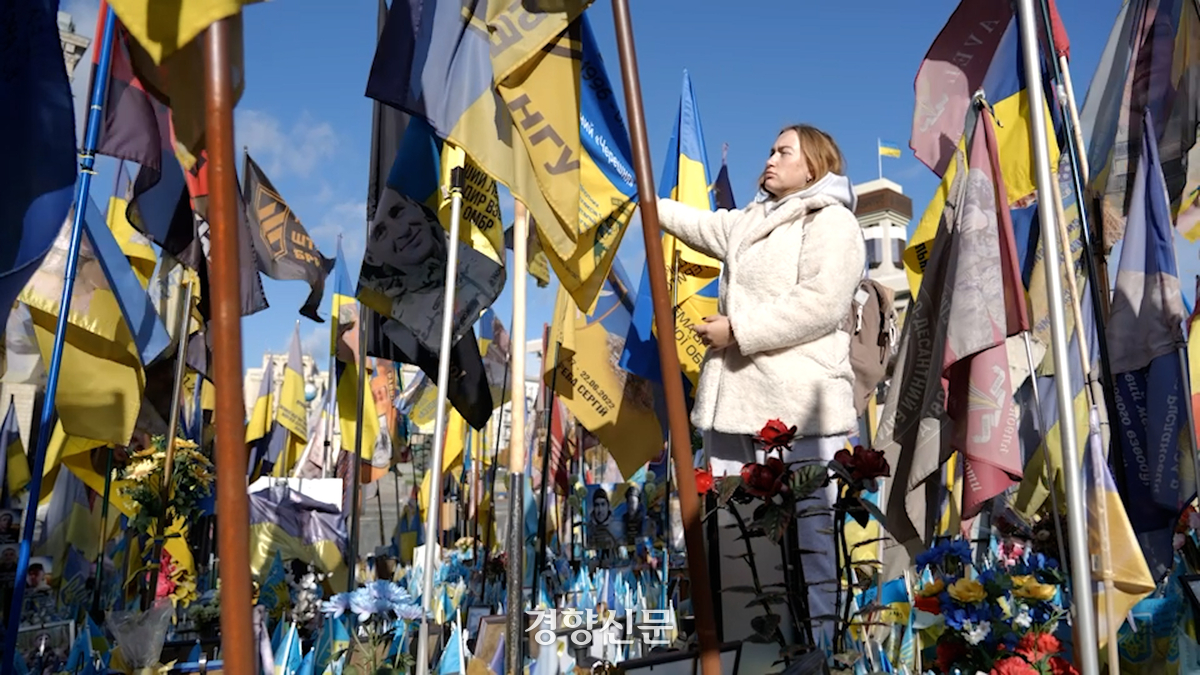 우크라이나 수도 키이우에 위치한 마이단 광장. 이곳은 2014년 유로마이단 혁명이 일어난 장소로 ‘민주광장’이라고도 불린다. 지난해 10월 찾은 이곳에는 우크라이나 전쟁 전사자들을 기리는 깃발이 많이 꽂혀 있었다. 그중에 유독 쿠르스크에서 사망했다는 표식이 많았다.