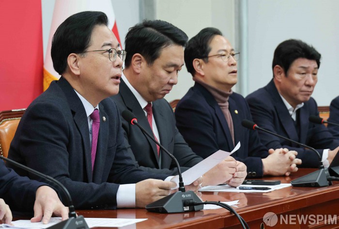 [서울=뉴스핌] 윤창빈 기자 = 송언석 국민의힘 원내대표가 20일 서울 여의도 국회에서 열린 원내대책회의에서 모두발언을 하고 있다. 2026.01.20 pangbin@newspim.com |