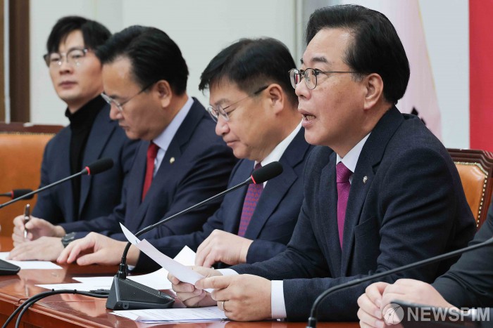[서울=뉴스핌] 윤창빈 기자 = 송언석 국민의힘 원내대표가 20일 서울 여의도 국회에서 열린 원내대책회의에서 모두발언을 하고 있다. 2026.01.20 pangbin@newspim.com