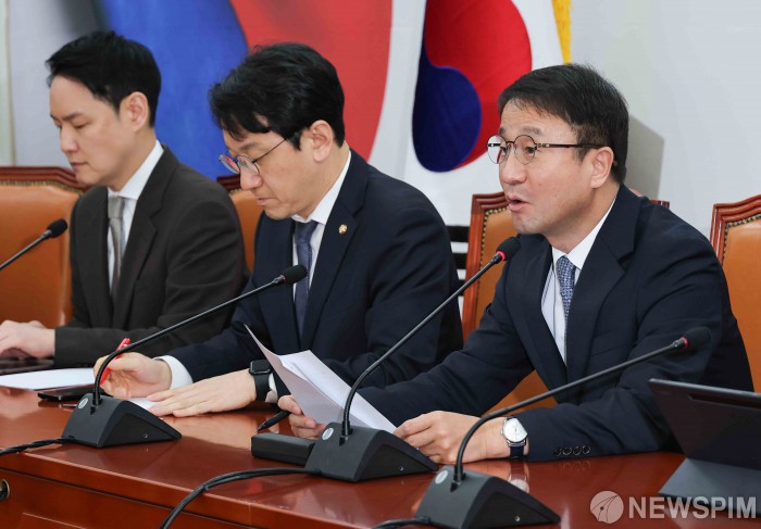 [서울=뉴스핌] 윤창빈 기자 = 한병도 더불어민주당 원내대표가 20일 서울 여의도 국회에서 열린 원내대책회의에서 모두발언을 하고 있다. 2026.01.20 pangbin@newspim.com