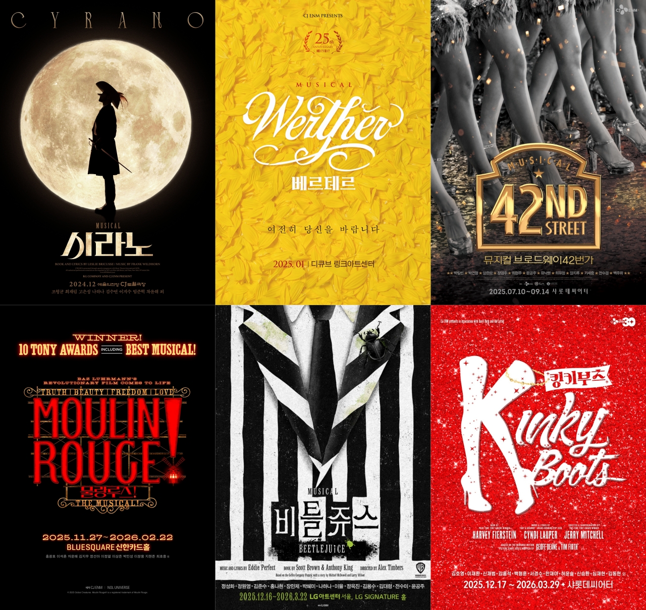 지난해 CJ ENM은 총 6편의 작품을 선보이며 관객과 만났다. RG컴퍼니와 함께 심혈을 기울여 완성도를 높인 뮤지컬 '시라노' 2025 시즌은 역대 프로덕션 중 최고의 흥행 기록을 세웠고, 5년 만에 돌아온 '베르테르' 25주년 공연은 시간이 흘러도 변치 않는 사랑의 찬가를 무대 위에 수놓으며 전국적인 성황을 이뤘다. 쇼 뮤지컬의 레전드 '브로드웨이 42번가' 역시 평점 9.8이라는 호평 속에 서울 공연과 지방 공연을 성공적으로 마쳤다. 연말에는 토니어워즈를 비롯해 각종 글로벌 어워즈를 휩쓴 브로드웨이 흥행작 뮤지컬 '킹키부츠', '물랑루즈!', '비틀쥬스'를 동시기에 개막하며 'CJ ENM 뮤지컬 유니버스'를 구축했다는 평을 받았다.