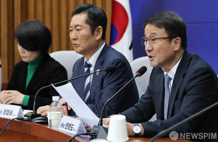 [서울=뉴스핌] 윤창빈 기자 = 한병도 더불어민주당 원내대표가 20일 서울 여의도 국회에서 열린 정책의원총회 겸 공소청법-중대범죄수사청법 공청회에서 인사말을 하고 있다. 2026.01.20 pangbin@newspim.com