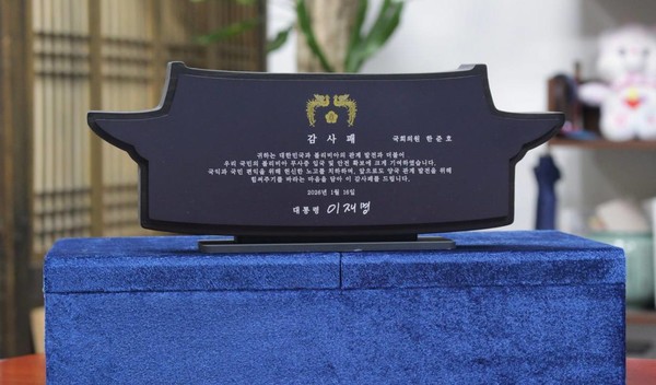 한준호 더불어민주당 의원이 이재명 대통령 명의의 감사패를 오늘(20일) 공개했습니다.