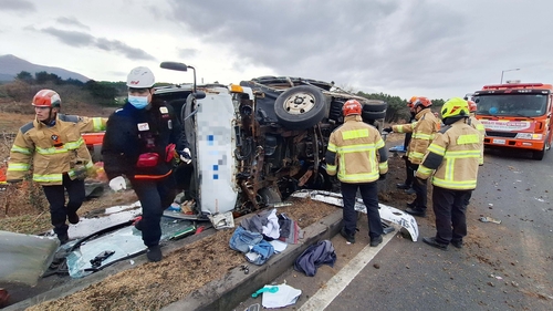 (제주=연합뉴스) 변지철 기자 = 제주의 한 도로에서 화물차가 전도돼 1명이 숨지고 1명이 다쳤다.