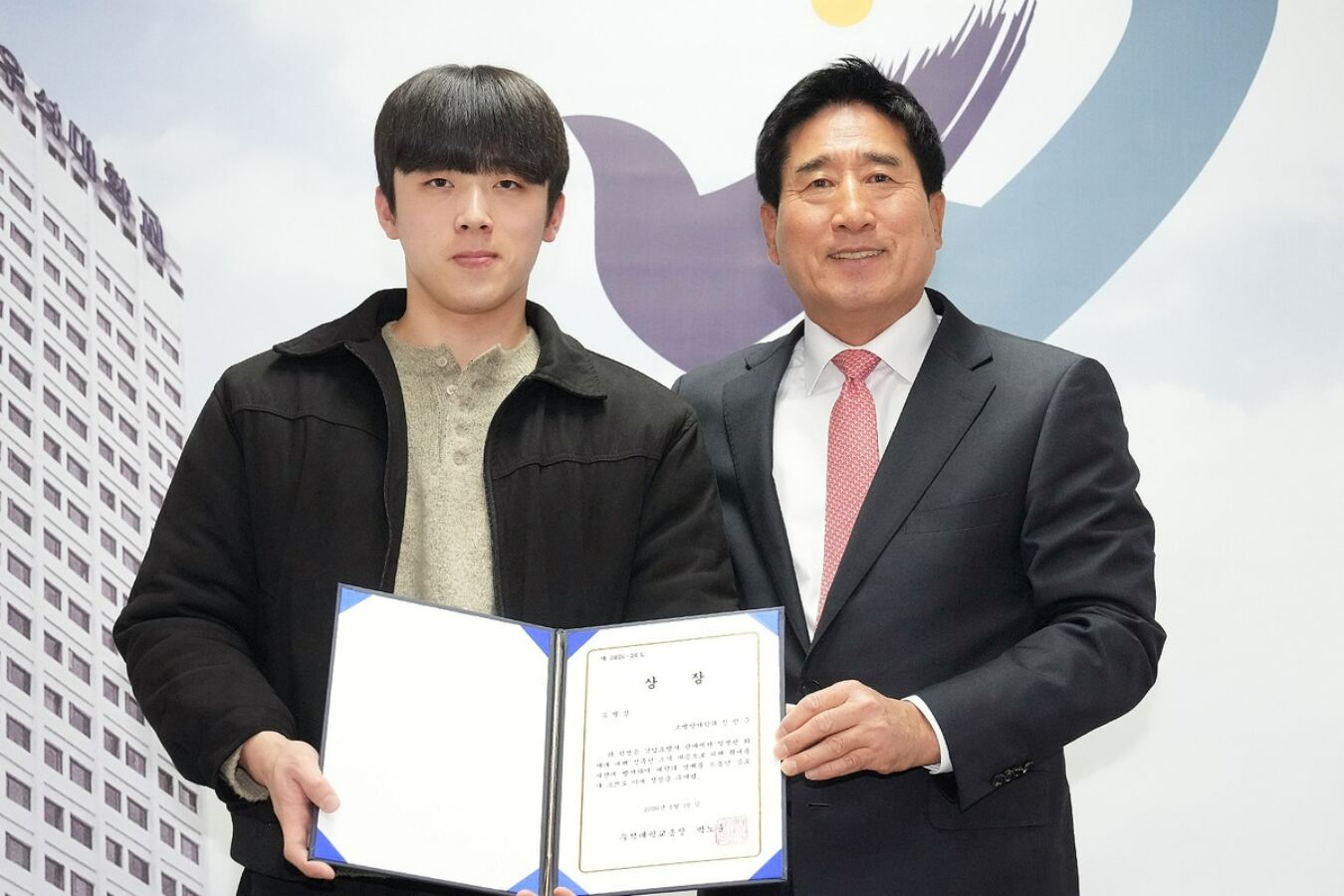 박노준 우석대 총장(오른쪽)이 전공 지식을 화재 현장에서 민첩히 행동해 초기 진화를 돕고 시민의 안전을 지킨 소방방재학과 2학년 신민준 학생에게 특별상을 수여한 뒤 기념 촬영하고 있다. 우석대 제공 |