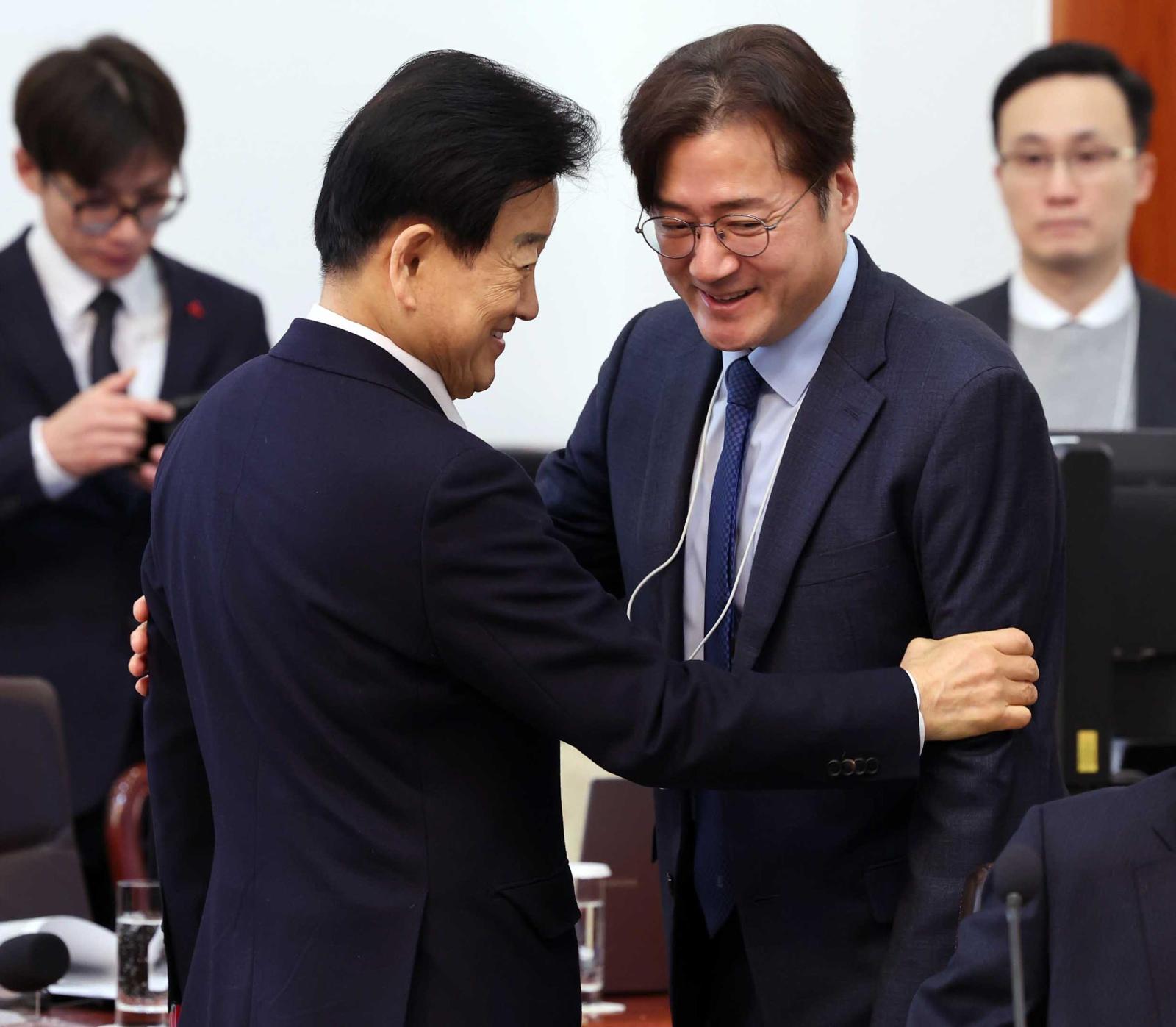 홍익표 신임 대통령정무수석비서관(앞줄 오른쪽)이 20일 청와대 본관에서 열린 국무회의에서 정동영 통일부 장관과 인사하고 있다. 청와대사진기자단 |