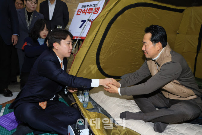 이 대표는 21일 오전 9시께 서울 여의도 국회 로텐더홀에 마련된 장 대표의 단식투쟁장을 방문했다. 현장에는 송언석 국민의힘 원내대표와 이기인·김성열 개혁신당 최고위원 등이 배석했다. 장 대표는 산소유지장치를 착용한 채 누워 있다가 이 대표를 맞이했다.