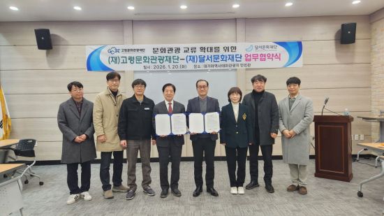 고령문화관광재단과 달서문화재단은 지난 20일 고령군 대가야역사테마관광지 인빈관에서 상호협력 확대를 위한 업무협약을 체결했다. 이날 협약식에는 두 기관 관계자들이 참석해 문화관광 산업 활성화와 공동 발전 방안에 뜻을 모았다.
