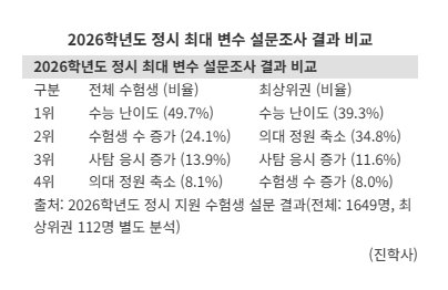 이는 전체 수험생 조사에서 1위와 2위 변수 간 격차가 25.6%p에 달했던 것과 대조적인 결과다. 최상위권 수험생들에게는 시험의 난이도만큼이나 의대 모집 정책의 변화가 정시 전략 수립 과정에서 매우 중요한 고려 요인으로 작용했음을 보여준다.