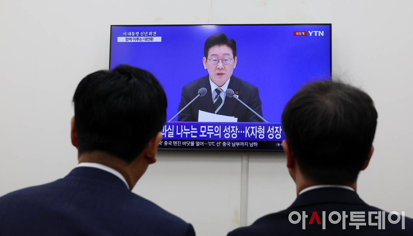 아시아투데이 송의주 기자 = 정청래 더불어민주당 대표와 한병도 원내대표가 21일 국회에서 이재명 대통령의 신년 기자회견 생중계를 지켜보고 있다.