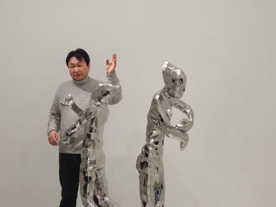 21일 서울 종로구 노화랑에서 열린 기자간담회에서 조각가 김성복이 작품 설명하고 있다. 엇갈린 두 조각의 허리춤에 움푹 패인 자국은 서로의 손이 있던 자국이자, 그리움을 상징한다. 서믿음 기자 |