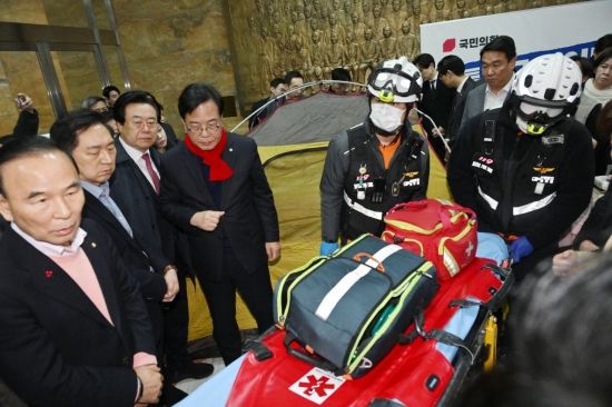 21일 국민의힘 장동혁 대표가 이레째 단식 농성 중인 국회 로텐더홀에 구급대원들이 도착하고 있다. 2026.1.21 김현민 기자 |