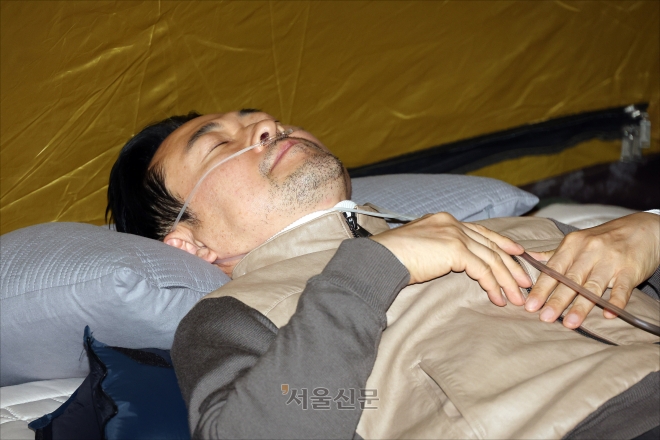 ‘통일교·공천헌금’ 쌍특검법 수용 촉구 단식 7일 차를 맞은 장동혁 국민의힘 대표가 21일 국회 로텐더홀 단식농성장에서 휴식을 취하고 있다. 안주영 기자 |