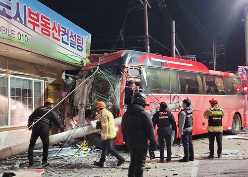 (원주=연합뉴스) 양지웅 기자 = 21일 오후 8시 8분께 강원 원주시 국과수사거리에서 관광버스가 승용차에 이어 전봇대를 들이받았다.