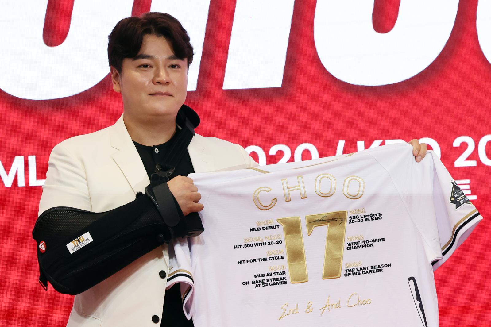 추신수 SSG 구단주 보좌 겸 육성총괄이 21일 미국 야구 명예의 전당 투표에서 3표를 받았다. 사진은 2024년 11월 은퇴 기자회견 때 유니폼을 펴 보이는 모습. 인천=뉴스1 |