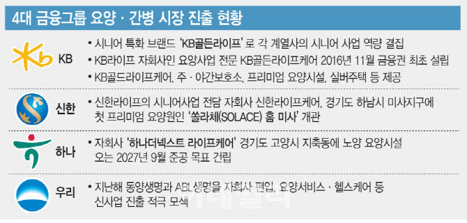 금융권 관계자는 “급격한 고령화로 국내 요양시장 규모가 급격하게 커지고 있는 상황에서 보험사를 가진 4대 금융에선 비은행 부분의 핵심 사업으로 키우고 있다”며 “요양 사업이 은행과 비은행의 모든 서비스를 하나로 연계해 시너지를 낼 수 있는만큼 4대 금융은 관련 사업을 계속 확대할 것으로 본다”고 했다.