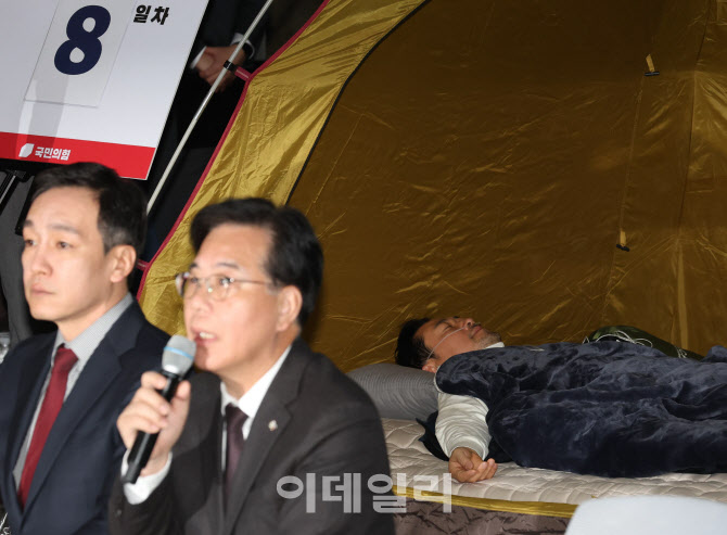[이데일리 노진환 기자] 통일교 및 공천헌금 특검 수용을 촉구하며 8일째 단식을 이어가고 있는 장동혁 국민의힘 대표가 22일 서울 여의도 국회 로텐더홀 농성장에 마련된 텐트 안에 누워 있다. 송언석 원내대표가 최고위원회의에서 모두발언을 하고 있다. |