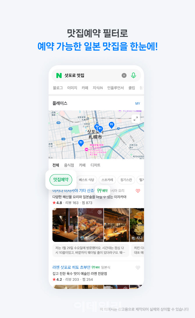 네이버는 일본 최대 음식점 정보 플랫폼 타베로그 데이터와 연동해 일본 현지에서 예약 가능한 식당만 모아볼 수 있는 ‘맛집예약’ 검색 필터를 도입했다고 22일 밝혔다.