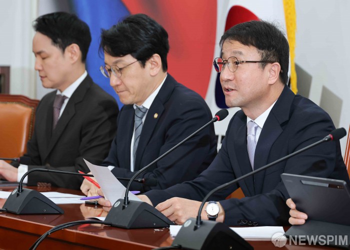 [서울=뉴스핌] 윤창빈 기자 = 한병도 더불어민주당 원내대표가 22일 서울 여의도 국회에서 열린 정책조정회의에서 모두발언을 하고 있다. 2026.01.22 pangbin@newspim.com