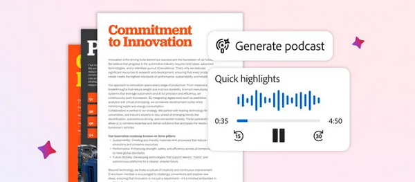 콘텐츠 생성 기능도 확대됐다. 제너레이트 팟캐스트(Generate Podcast)는 PDF와 문서 내용을 음성 개요 형태로 변환해 제공하며, 제너레이트 프레젠테이션(Generate Presentation)은 문서를 프레젠테이션 슬라이드로 자동 변환한다. 해당 기능은 어도비 익스프레스를 기반으로 다양한 템플릿과 맞춤형 이미지 생성을 지원한다.