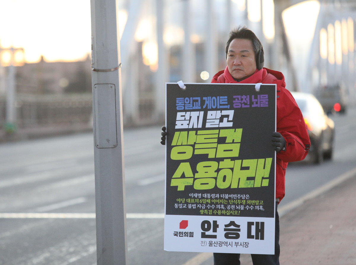 안 예정자는 "국민의힘 장동혁 대표가 목숨을 건 단식 사투 8일째를 맞고 있다"며 "영하 10도가 넘는 혹한 속에서도 이를 외면할 수 없어 1인시위에 나섰다"고 시위 배경을 밝혔다.