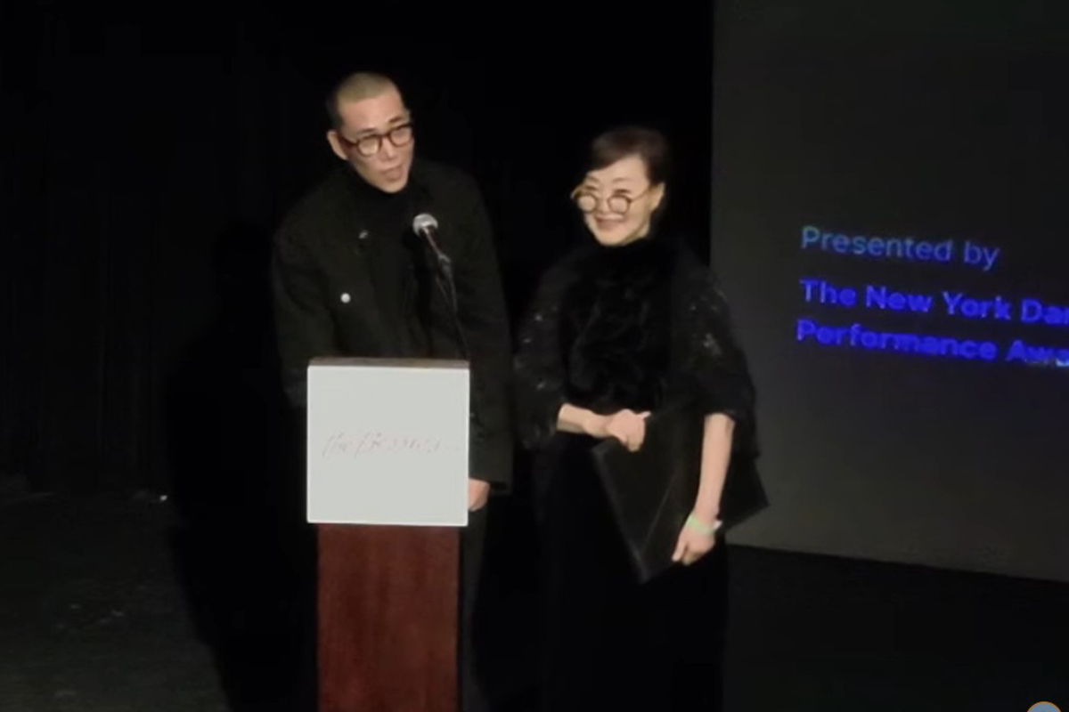 서울시무용단 ‘일무’의 정혜진(오른쪽)·김성훈 안무가가 20일(현지시간) 미국 뉴욕 딕슨 플레이스에서 열린 ‘뉴욕 댄스&퍼포먼스 어워드(베시 상)’에서 최우수 안무가·창작자상을 받은 후 소감을 말하고 있다. 유튜브 시상식 중계 화면 캡처 |