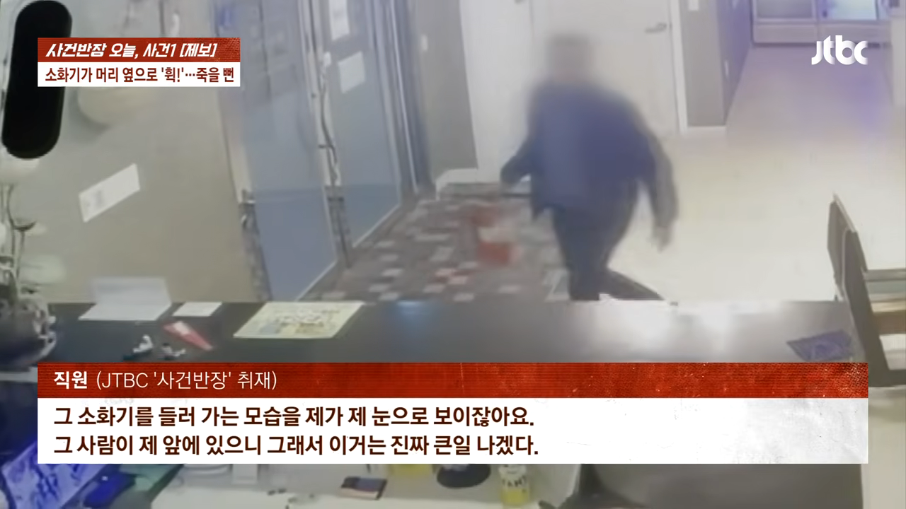 A씨는 “소화기가 머리에 맞았으면 정말 즉사할 수도 있겠다는 생각이 들었다”며 “유리 장식품도 깨졌는데 그걸 들고 공격할까 두려웠다”고 당시 상황을 돌아봤다.