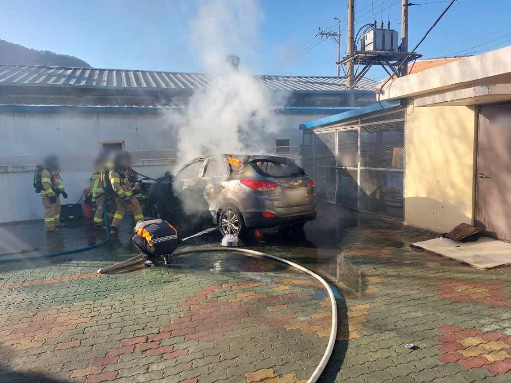 오늘(22일) 오전 9시 10분쯤, 부산시 사상구의 한 초등학교 야외 주차장에 주차돼 있던 SUV에서 불이 났다.