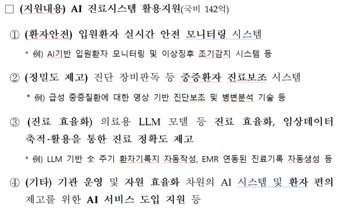 진료 효율화 분야는 의료 문서 작성 등 반복적 행정업무를 자동화하는 AI 시스템을 도입해 의료진 업무 부담을 줄이고 진료 집중도를 높이는 것을 목표로 삼았다. 복지부는 권역책임의료기관 내 환자 편의를 위한 실시간 통역 서비스, AI 상담·알람서비스 등 환자 편의 제공·운영 효율화를 위한 AI 기반 시스템 도 지원 대상에 포함했다.