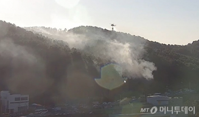 부산 기장군 기장은 청강리 산7419의 일원에서 발생한 산불이 이틀째 이어진 22일 소방 헬기가 공중에서 진화 작업을 벌이고 있다. /사진=뉴시스 |