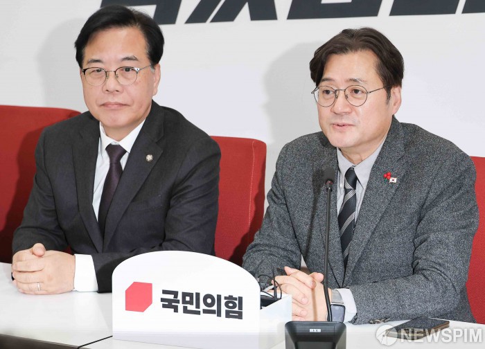 [서울=뉴스핌] 윤창빈 기자 = 홍익표 청와대 정무수석이 22일 서울 여의도 국회에서 송언석 국민의힘 원내대표를 예방한 가운데 발언하고 있다. 2026.01.22 pangbin@newspim.com