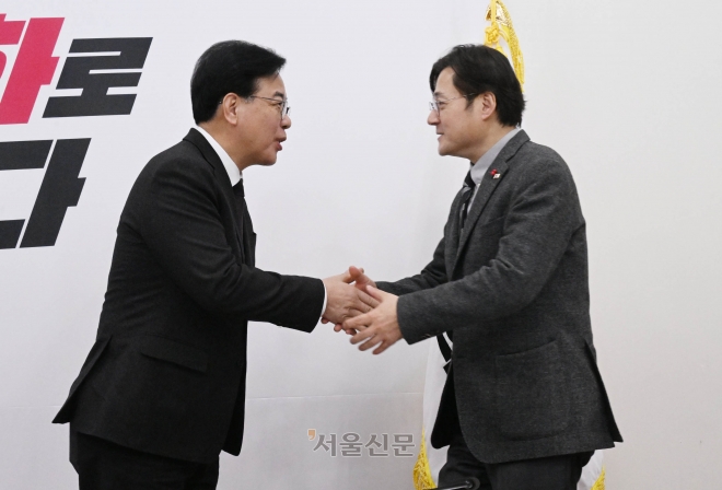 송언석 국민의힘 원내대표가 22일 오후 서울 여의도 국회에서 홍익표 대통령비서실 정무수석을 접견하며 악수를 하고 있다. 2026.1.22.안주영 전문기자 |